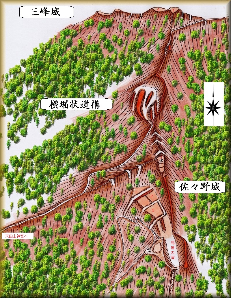 三峰城は、ささやかな防御遺構といった趣の城である。佐々野城の北方を監視するための小規模な砦であったものであろう。