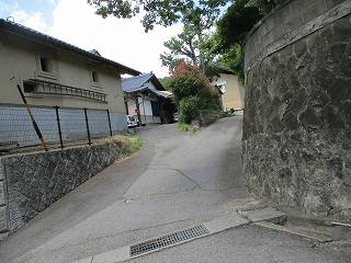| 東側の入口は堀跡のように見える。 | 民家の敷地内に土塁が見えているが、私有地なので入って行けない。 |