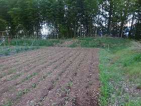 | 1郭内部は一面の畑だが、土塁が残されている。 | 2郭西側の堀跡。 |