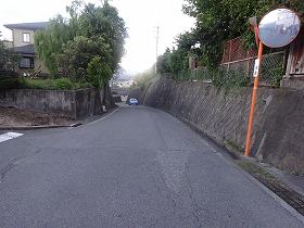 そこまで降りてくると、すぐ下の道路が見えてきていた。しかし、この先は急傾斜である。このまま降りていけるかどうか一瞬迷ったのだが、引き返すのが面倒だったので、そのまま降りてしまった。しかし、先に述べた通り、ヤブがなく掴まるものが少ないので、危険な斜面であり、かなり注意を要する。この城の斜面をそのまま降りていくことはお勧めできない。