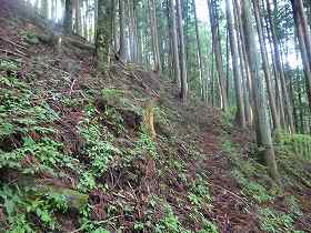 この下の部分が傾斜地形ながらもけっこう広い空間となっている。この部分も郭のように見えるのであるが、建造物を建てるのはこの傾斜地形では難しいであろう。これを郭と呼んでいいのかどうか、判断に迷うところである。