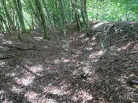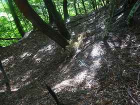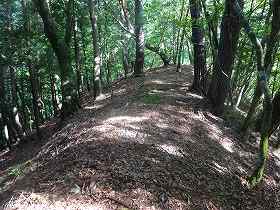 進んで行くと、2郭の北側の部分に到達した。ここは東西の両方に降っていく道と合流する地点で、道が多少切通し状になっているところである。この場所にかつて堀切が存在していた可能性が高い。