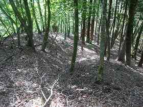 1郭から北側には尾根は緩やかに降って行く。途中に何段かごく小さなテラス状の部分が見られるのだが、郭と呼べるほどしっかりとしたものではない。