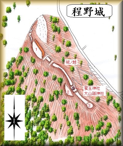 程野城は、矢筈トンネルの上村側入口のすぐ東側にそびえる比高100mほどの山稜に築かれていた。蛇洞林道の方に入り込み、山稜の東側に回り込んで行くと、こちら側からの比高は50mほどである。