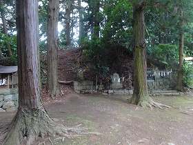 | 1郭にある飯沼諏訪神社。 | 神社背後の土塁。大きく重厚なものである。 |