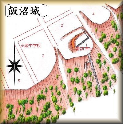 飯沼諏訪神社のある台地縁部が飯沼城の跡である。東側の台地下からの比高は40mほどあり、鋭い斜面となっている。高陵中学校のすぐ東側であり、中学校も3郭および5郭の跡であると推測される。