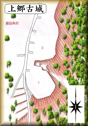 上郷古城は、県立飯田高校の南西100mほどの台地縁部に築かれていた。台地そのものは広大なものであるが、東側の縁は比高40mほどの断崖になっており、この方向からの守りは固い。