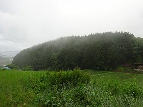 | 北方から見た原ノ城のある台地。比高20mほどである。 | 1郭西側の堀跡。 |