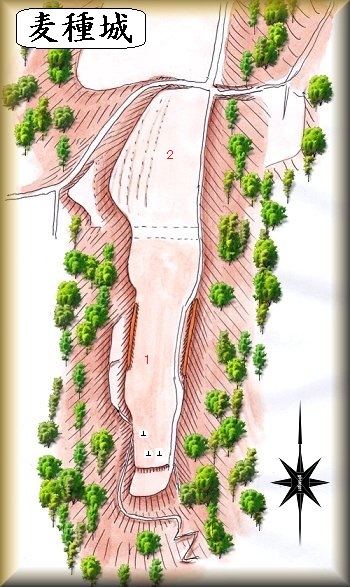 | 東側から遠望した麦種城のある台地。 | 先端部に続く通路。左側が東側の土塁である。 |