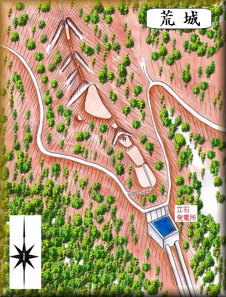 立石水力発電所の北側にそびえる比高130mほどの山稜が荒城の跡である。遠目に見るとかなり高く見える山稜であるが、山の中腹には立石水力発電所があり、その上の部分を通る林道があるようで、これを目指しいていけば、城内にすぐに入れるところまで車で行けそうである。