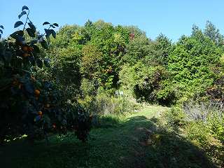 登ったところが畑となっていた。3の郭である。北側には墓地が見え、その背後に山林がそびえている。こちらが2郭のある山稜である。