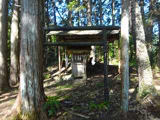 主郭の手前には浅い堀切があり、そこに祠が祭られている。そこから下に段々に畑となっていた郭が2つほど続いていたようである。このように見てくると、明瞭な郭は主郭だけであり、小規模な砦といった規模のものであるように思われる。