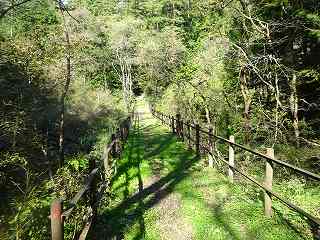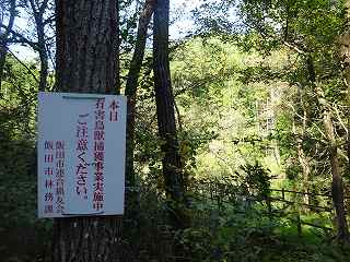 どうやらイノシシやシカ、あるいはクマなどを猟師が撃っているらしい。これまた怖い。しかし「注意」とあるだけで「立入禁止」とはなっていない。見通しの悪くない遊歩道を進んで行くだけならば撃たれることはないだろう。それに私は目立った色の服を着ている。山城めぐりをしている人が基本的に目立った色(特に自然界の動物にはない色)の服装をしているのは、1つには猟師に間違って撃たれないためである。そんなわけで、迷うことなく山に入って行く。