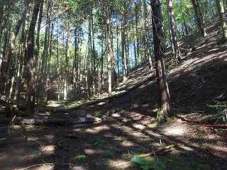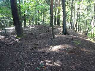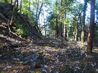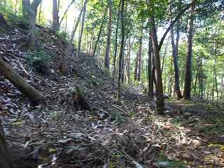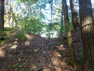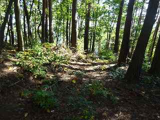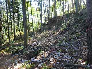 | 鞍部にある堀切。 | 鞍部から見た1郭城塁。 |