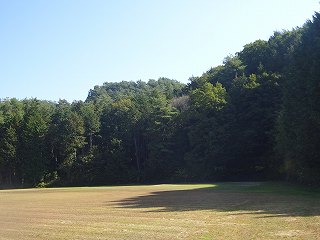 工場の北側にグラウンドがあるが、その先に茶臼山の山頂部が見えている。山頂部を目指して進んでいった一番奥の突き当り辺りが入口になっている。車は、どこか道路の余白があるところに停めておくしかない。