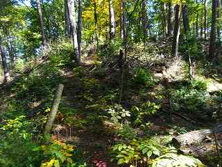 | すると遊歩道の案内表示がある。 | 遊歩道をずっと進むのではなく、この地形が見えてきたら、右手上の山稜部を目指していく。するとすぐに1郭下の鞍部に到達する。 |