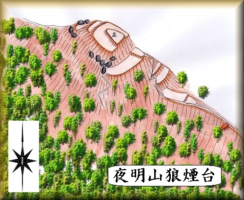 「夜明山」という名称はここが監視所であったということを暗示している。小笠原領域、あるいは甲賀領域の境目を監視し狼煙で連絡するための施設があった場所、というように考えるのがよさそうである。