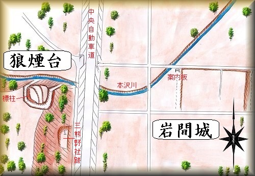 高速道路の高架下をくぐって西側に抜けると、その西側の台地先端部が狼煙台となっている。高架下から南側に進んで行くと、台地麓辺りに「三熊野社跡」と書かれた標柱が立てられているのが見える。そこから台地を上まで登って北側に進んで行くと、そこに堀があり、城内側に「岩間狼煙台跡」と書かれた標柱が立てられている。