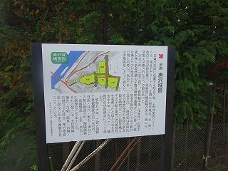 そうしていくつめかの台地を東側の先端部分まで進んで行くと、その先に案内板が立てられているのが目に入ってきた。車を降りて確認してみると、確かに唐沢城の案内板であった。何とか城址に到達できたというわけである。
