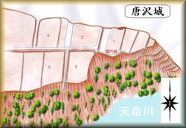 県道200号線の北側、天竜川に臨む断崖上が唐沢城の跡である。
