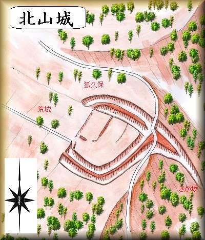 県道220号線が蛇行しながら台地に上がって行く部分の北側一帯が北山城の跡である。