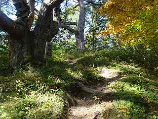 獣除けの柵を開けて山道に入って行く。道はわりと整備されており、斜面に対してジグザグに登って行くようになっているので、それほどきつくはない。そうして登って行くと、「御嶽山の松並木」という案内があった。