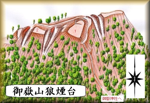 御嶽山の山頂部分が御嶽山狼煙台の跡でありgooglemapにも岩間山城として掲載されている。
