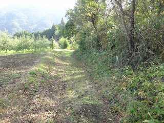 | トヤゴ城の遠景。西側は与田切川に削られた断崖となっている。 | この通路は堀跡であろうか。脇に堀跡らしき窪みも見られる。 |
