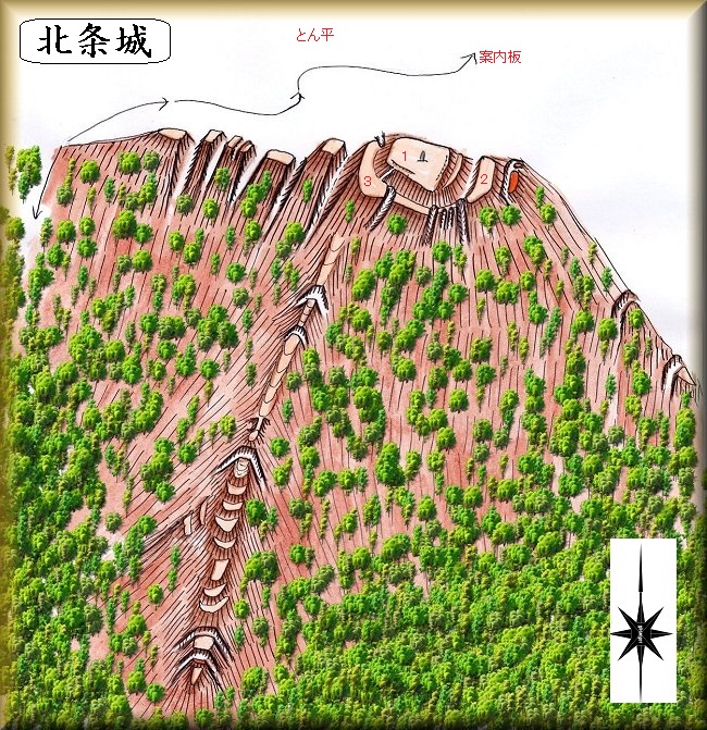 ということで、とん平に向かう舗装された道を進んで行くと、この地点に北条城の案内板が設置されている。ここが登城口で、道路脇に駐車スペースもある。登り口から1郭までの比高は100mほど。15分もあれば余裕で到達できる。
