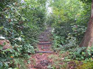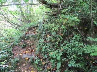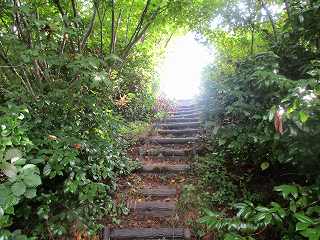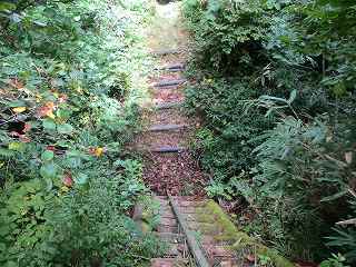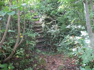 遊歩道を進んで行くと、やがて最初の堀切が現れる。深さ6mほどの堀切である。この堀切の両側の壁面部に階段が付けられていて、昇り降りは容易にできるようになっているのだが、堀切の壁面に階段を付けるという整備方法は個人的にはあまり好きではない。本来の堀切の形状をかなり破壊してしまうからである。