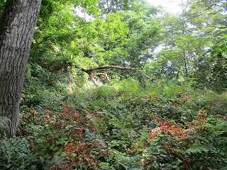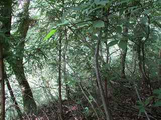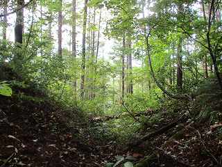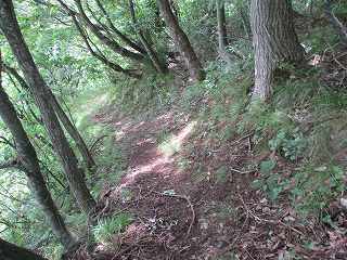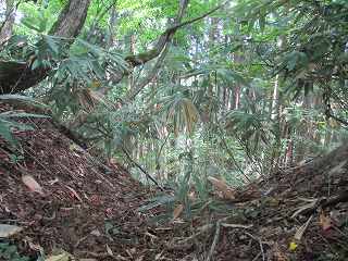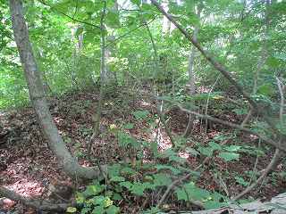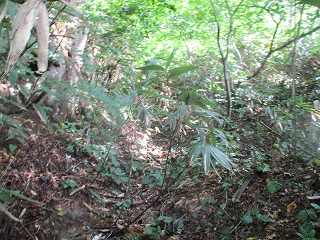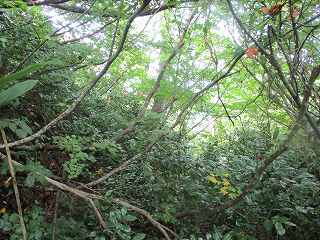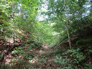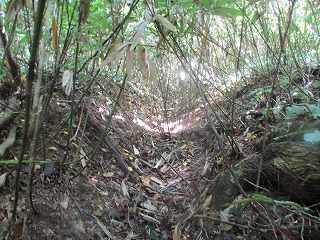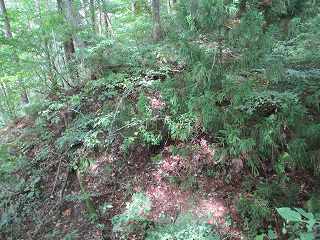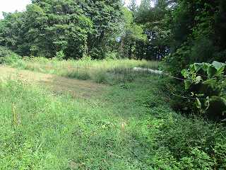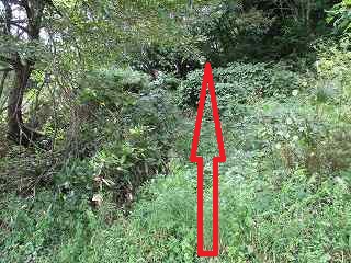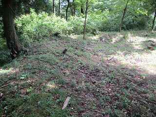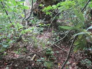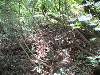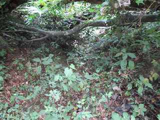 | 尾根をヤブ漕ぎ直登していったら、2郭に出た。ここだけがヤブではなかった。 | 2郭東側下の堀切。 |