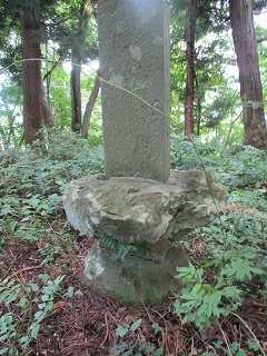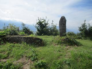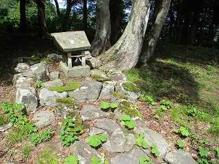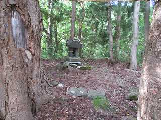 1郭内部には石碑が建てられていた。これは城址碑ではなく、御嶽座王大権現を祭ったものであった。かつてはこの碑を拝むために集落の人がここに登ってきていたのであろうか。その登路は現在では残されていない。