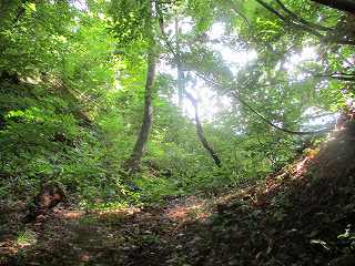この段郭の所から尾根伝いに主要部を目指して直登してみることにした。ところが、斜面はけっこうなヤブ状態となっている。雪国の木の特徴で雪の重さで下方に向かって傾いているため、天然逆茂木状態となっており、なかなか登れないのだ。このルートは失敗だったかなと思いながら頑張って登って行った。