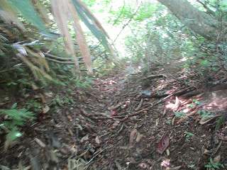 1郭からさらに北東に尾根が続いており、その先に4本の堀切があるらしい。というわけで、北東の尾根に降りて行ったのだが、その先はヤブがひどくて、途中であきらめた。1郭のすぐ北東側の堀切は小規模なものであった。1郭に一番近いところの堀切が小規模であるということは、その先の堀切も推して知るべきである。おそらく小規模なものなのだろうと思う。