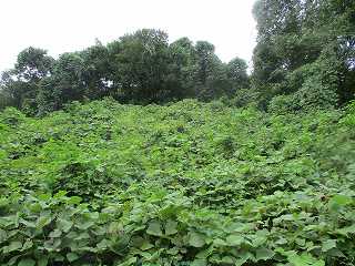 | 1郭土塁。どこまで行ってもヤブしかない・・・・。 | 1郭背後の堀切。 |