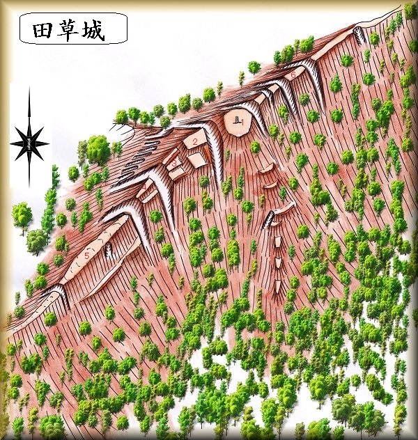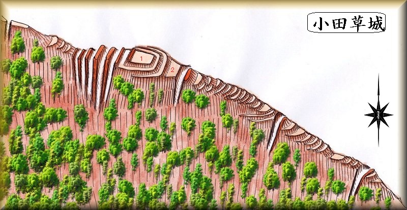 1郭背後には6連続の堀切を配置し、1郭の周囲にも帯曲輪を数段造成するなど、田草城よりもしっかりとした構造を示している。