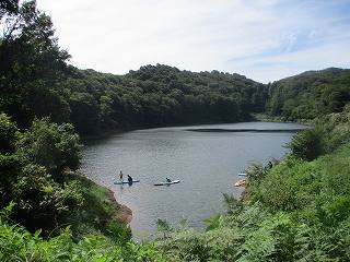 | 山麓から見上げる黒岩城。ここからの比高は570mもある。 | 黒岩山背後にある桂池。カヌーを楽しんでいる人たちがいた。 |