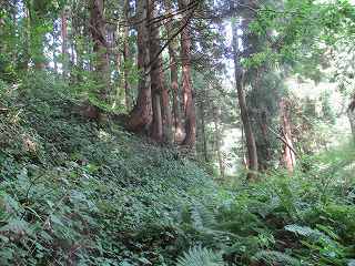 墓地の奥に3郭の城塁が見えている。その斜面には腰曲輪状のものが数段あるが、それほど明瞭なものではない。また、これらの間を抜けて城内に進入する道も現在では失われてしまっているようで、どこを通っても、最後は斜面直登で3郭に入って行くしかない。