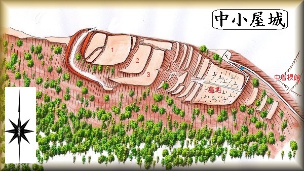 | 中小屋城は、中曽根重道によって築かれた城であったと伝えられている。中曽根氏は下方にある中曽根館の館主であったと考えられるから、中小屋城は詰の城として築かれたものであったと考えられる。 天正年間、中曽根氏は上杉氏の家臣となり、慶長3年(1598)には上杉氏の会津転封に伴って、中曽根氏も会津に赴いて行ったと言われている。 |