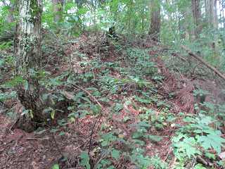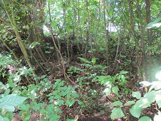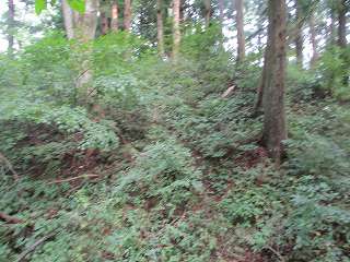 1郭の東側に下に堀切があり、その先に腰曲輪状の2郭がある。その先の尾根にも堀切が3本ほどあるようだが、こちらも夏場ではヤブ状態で入り込むのは難しい。