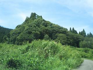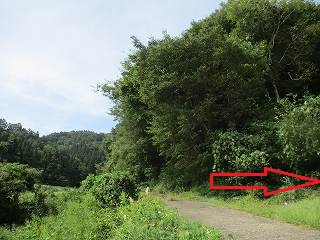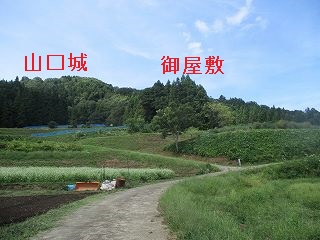 | 南方から見る山口出城。ここからの比高は30mほど。 | 登り口はここから右手に入って行く。 |