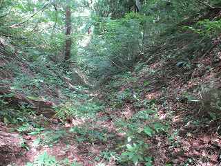 | この先を登ったところから参道が始まるのだが、ちょっと分かりにくい。 | 登城口が分からなかったので、側面部の竪堀から直登したら、三重堀切の一重目に出た。箱堀で堀底幅が6mほどあった。 |
