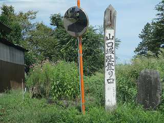 | 山麓の道路沿いにある目立つ標柱。これに従って進んで行く。 | 途中には案内の石碑がいくつかあって、これに従って進んで行けば迷うことはない。 |