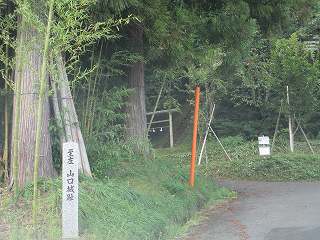 山口城は、山口地区の西方にそびえている比高220mほどの山稜に築かれている。この地点に入口の案内標柱が立てられており、後は案内に従って進んで行けば、城のすぐ下の鳥居のあるところまで車で行くことができる。所々に案内の石碑があり、左右のどちらに進むか指示があるので分かりやすい。