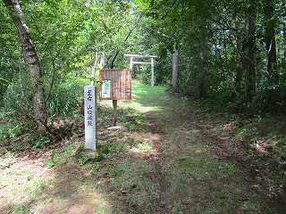 御屋敷の上辺りにある最後の案内石碑からは未舗装の林道をかなり進んで行く。この距離が長いので「行き過ぎてしまったのではないか」とちょっと不安になってしまうのだが、尾根の先端部分で右側に左折したところの先に鳥居があり、そこに山口城に関する案内板が設置されている。