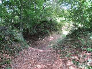 | 城に続く遊歩道。遊歩道以外の部分は猛烈なヤブである。 | 1本目の堀切。 |