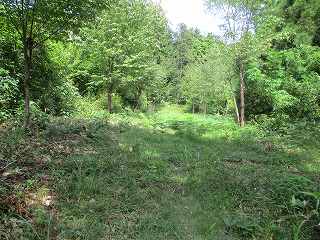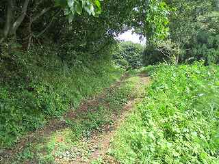 | 鳥居の所から3郭下の堀切に向かう尾根。軽トラなら登れる道である。 | 3郭手前の堀切。手前側は虎口状になっている。 |