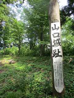 | 伝承によれば、山口城は、永正年間(1504〜1520)に岩井直信によって築かれた城であったという。岩井氏は尾崎氏の一族であった。 戦国時代、岩井信能は上杉氏に所属し、上杉家臣として各地を転戦した。そうした功績が認められてか、外様十人衆の首長となり、天正10年には飯山城代を任されるほどになった。 慶長3年(1598)、上杉景勝が会津に転封となると、岩井氏も会津に同行し、その後山口城も廃城となったものと考えられる。 |