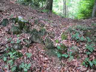 | 墓地。この先の山林が城址である。 | 3郭下の城塁。 |