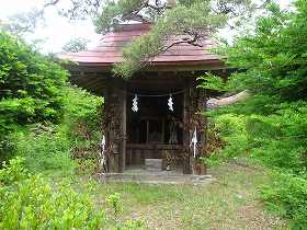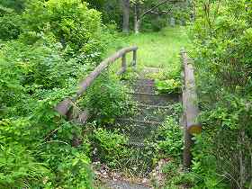 | 1郭南端部にある熊野神社。脇には古木が立っている。 | 2郭との間の堀切には橋が架けられている。堀切そのものはヤブがひどくてよく分からない。 |